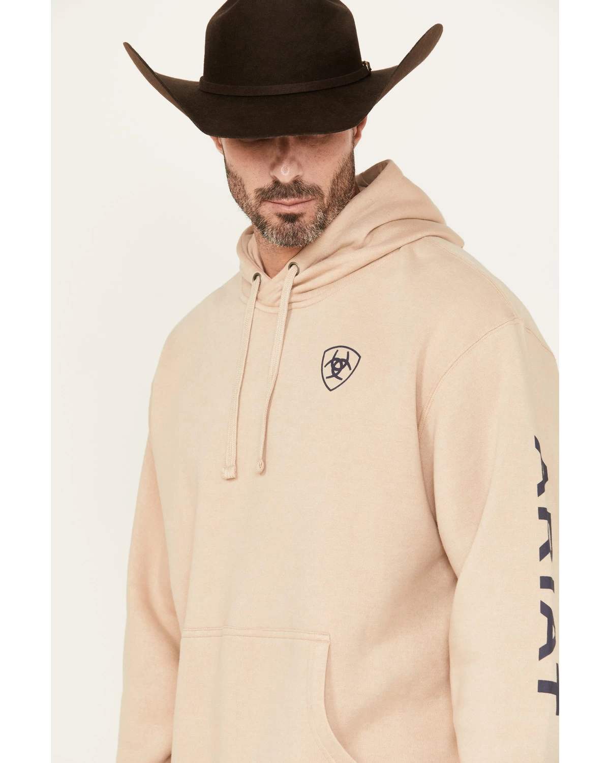 - Solid tan design with brown Ariat logos on left chest and sleeve