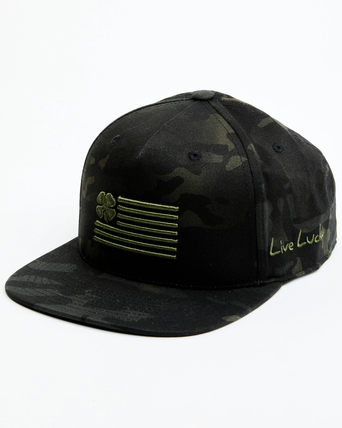 - Embroidered green Clover Nation flag design on front, “Live Lucky” on side