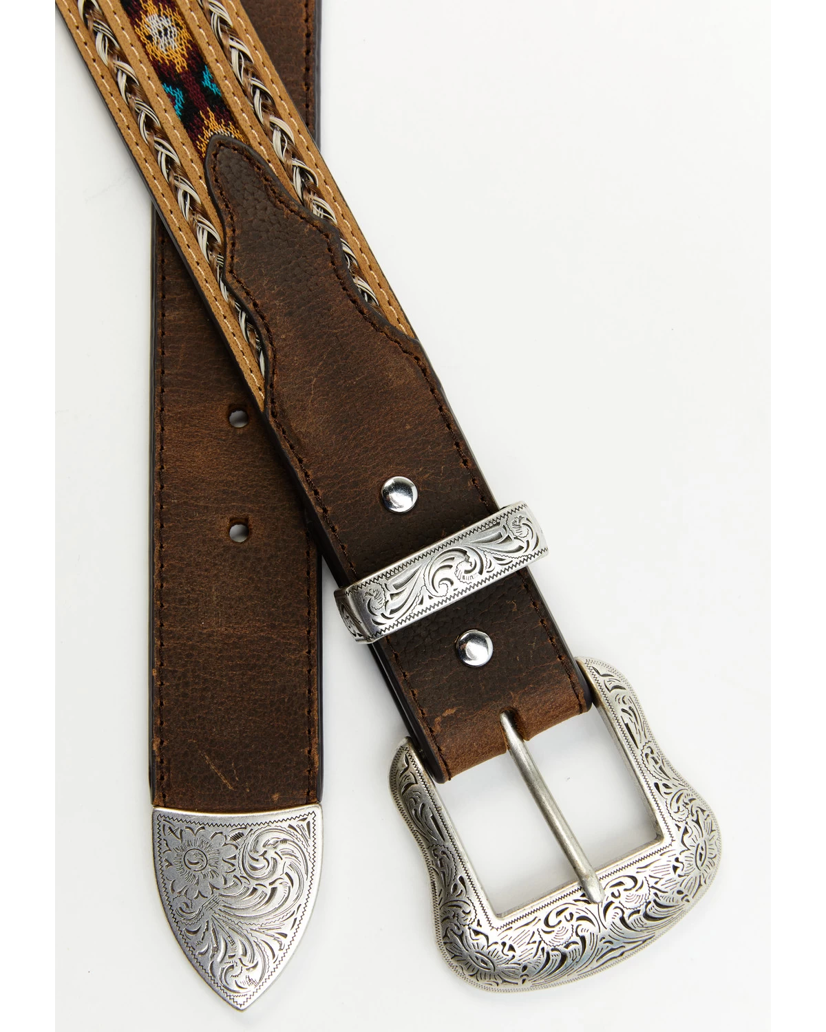 - Silver decorative-etched buckle, tips, and loop