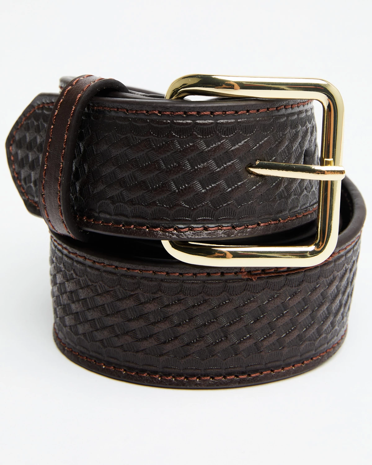 This men’s belt is crafted of genuine leather. Features a basketweave embossed design and gold-tone buckle. Men’s belt measures 1 1/2″ wide. Imported.