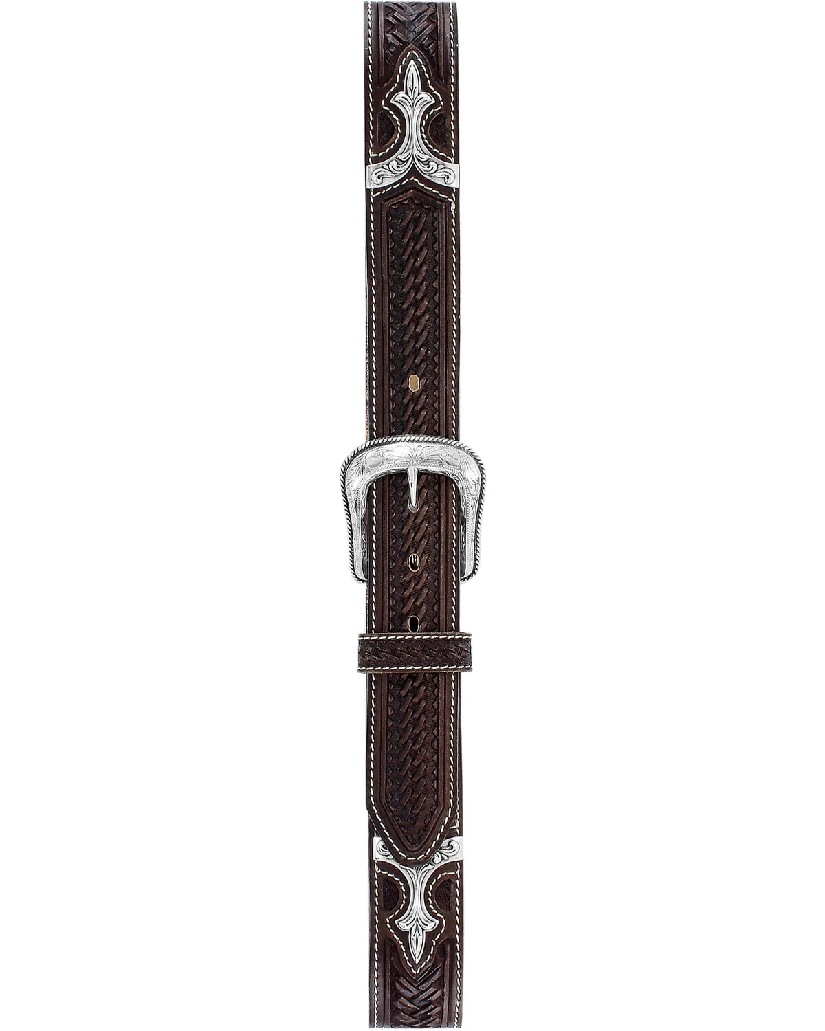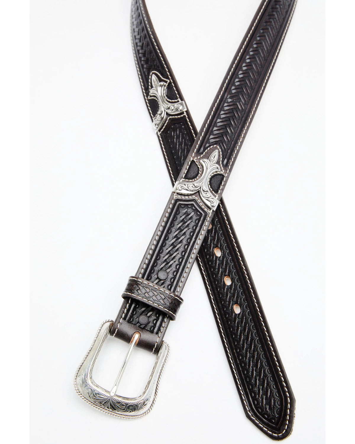 - Silver-tone etched western roller buckle
