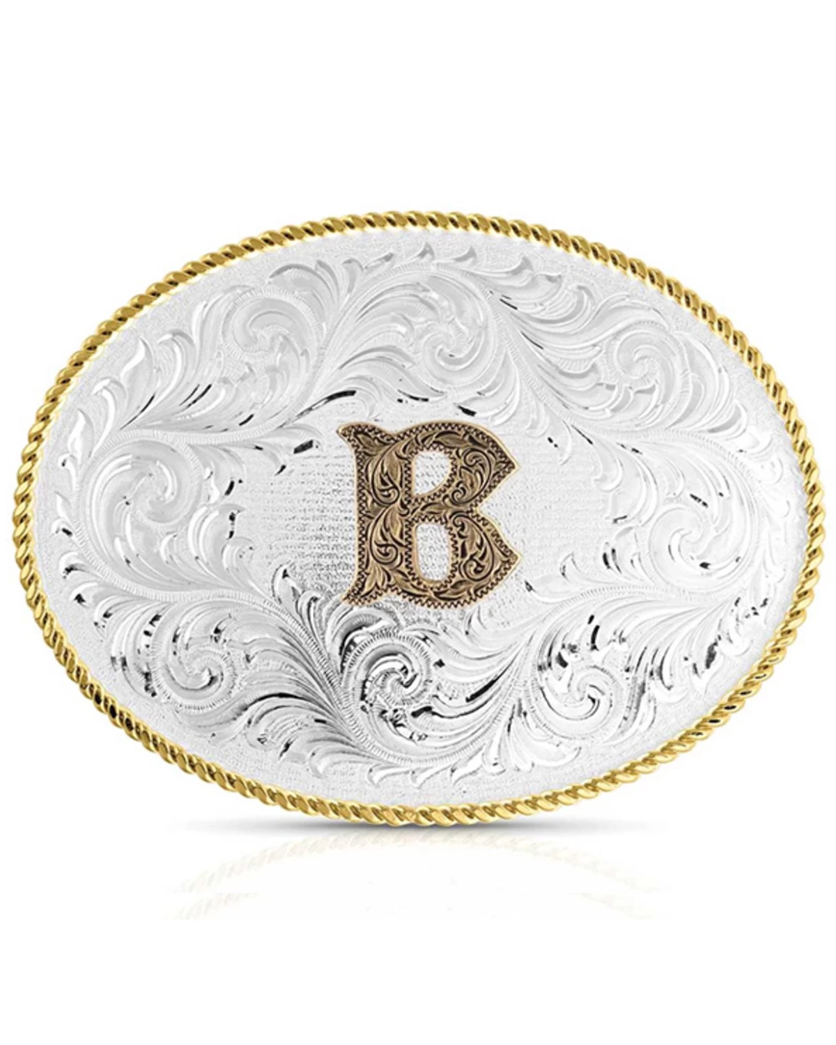 - Silver-toned oval buckle with gold roped border and “B” on front with silver-toned filigree details