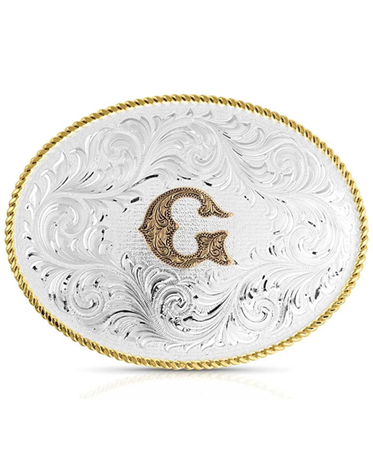 - Silver-toned oval buckle with gold roped border and “G” on front with silver-toned filigree details