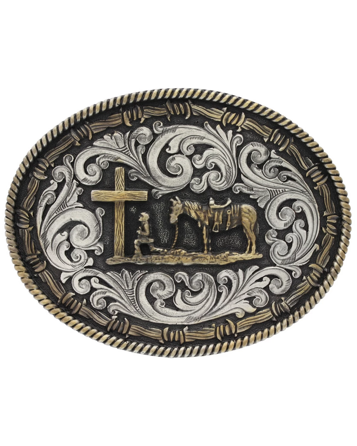 - Features a highly detailed traditional gold tone christian cowboy figure surrounded by classic silver tone filigree edged with gold tone barbed wire and twisted rope